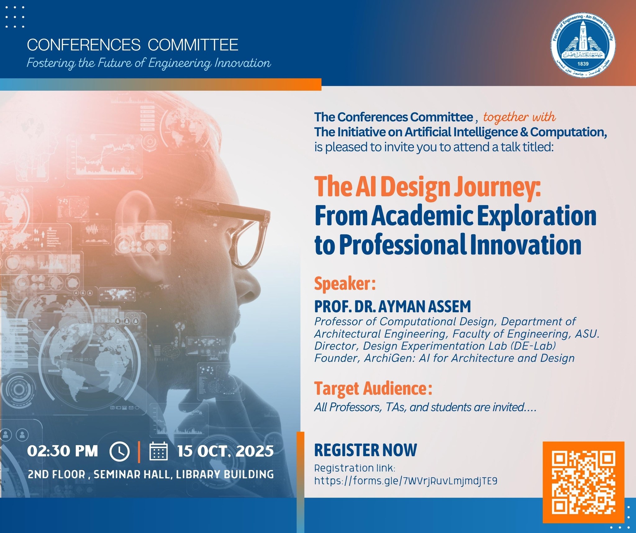 Join us this Wednesday, 15 October at 14:30 in The Library Hall, Faculty of Engineering, Ain Shams University, for an inspiring talk by Prof. Dr. Ayman Assem — Professor of Computational Design and Director of the Design Experimentation Lab (DE-Lab).