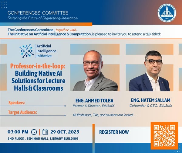 Wednesday, 29 October | 3:00 PM Seminar Hall, Library Building, Faculty of Engineering, Ain Shams University With Eng. Hatem Sallam & Eng. Ahmed Tolba from EduSofX — alumni transforming education with their AI-powered “learning buddy.”