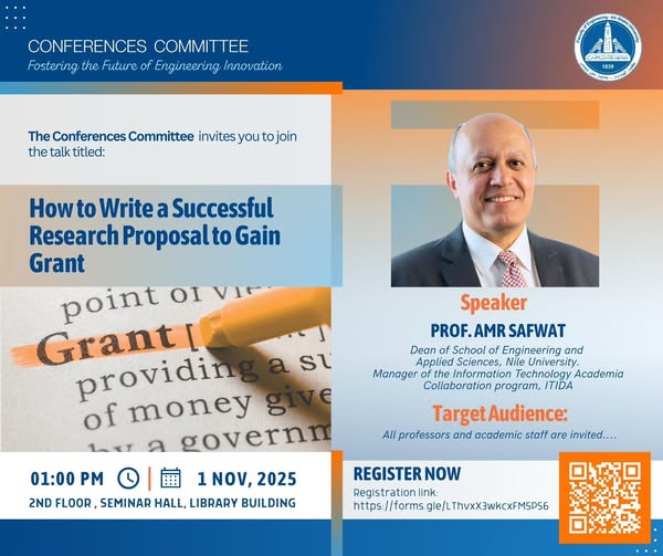 Join us for the talk “How to Write a Successful Research Proposal to Gain Grants” by Prof. Amr Safwat, Dean of Engineering, Nile University, and Manager of the ITIDA Academia Collaboration Program.
