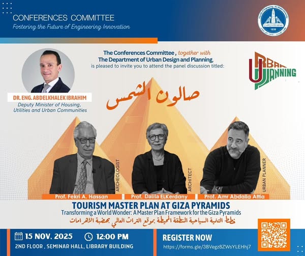 The Conferences Committee, in collaboration with the Department of Urban Design and Planning, proudly presents a special session of Salon Al-Shams — bringing together distinguished experts to discuss “Transforming a World Wonder: A Master Plan Framework for the Giza Pyramids.”