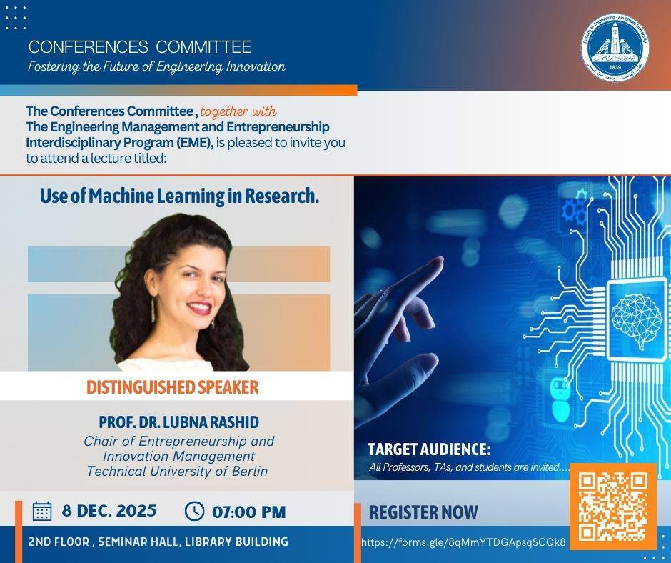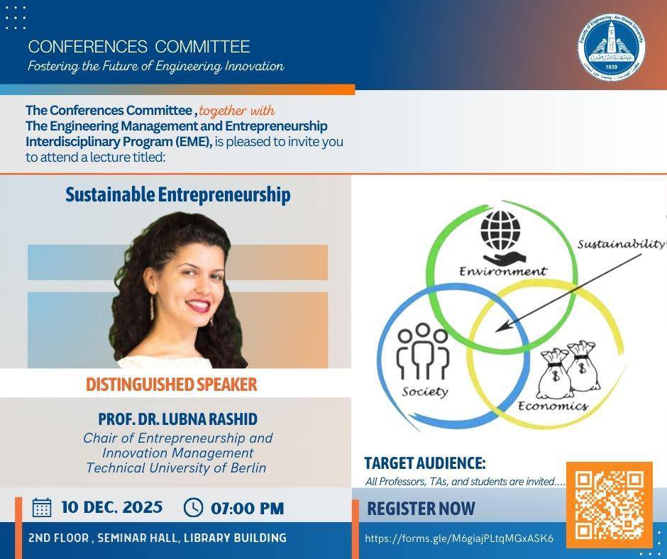 The Conferences Committee, together with the Engineering Management and Entrepreneurship Interdisciplinary Program (EME), is pleased to host Prof. Dr. Lubna Rashid, Chair of Entrepreneurship and Innovation Management, Technical University of Berlin, for two distinguished lectures at the Faculty of Engineering – Ain Shams University: