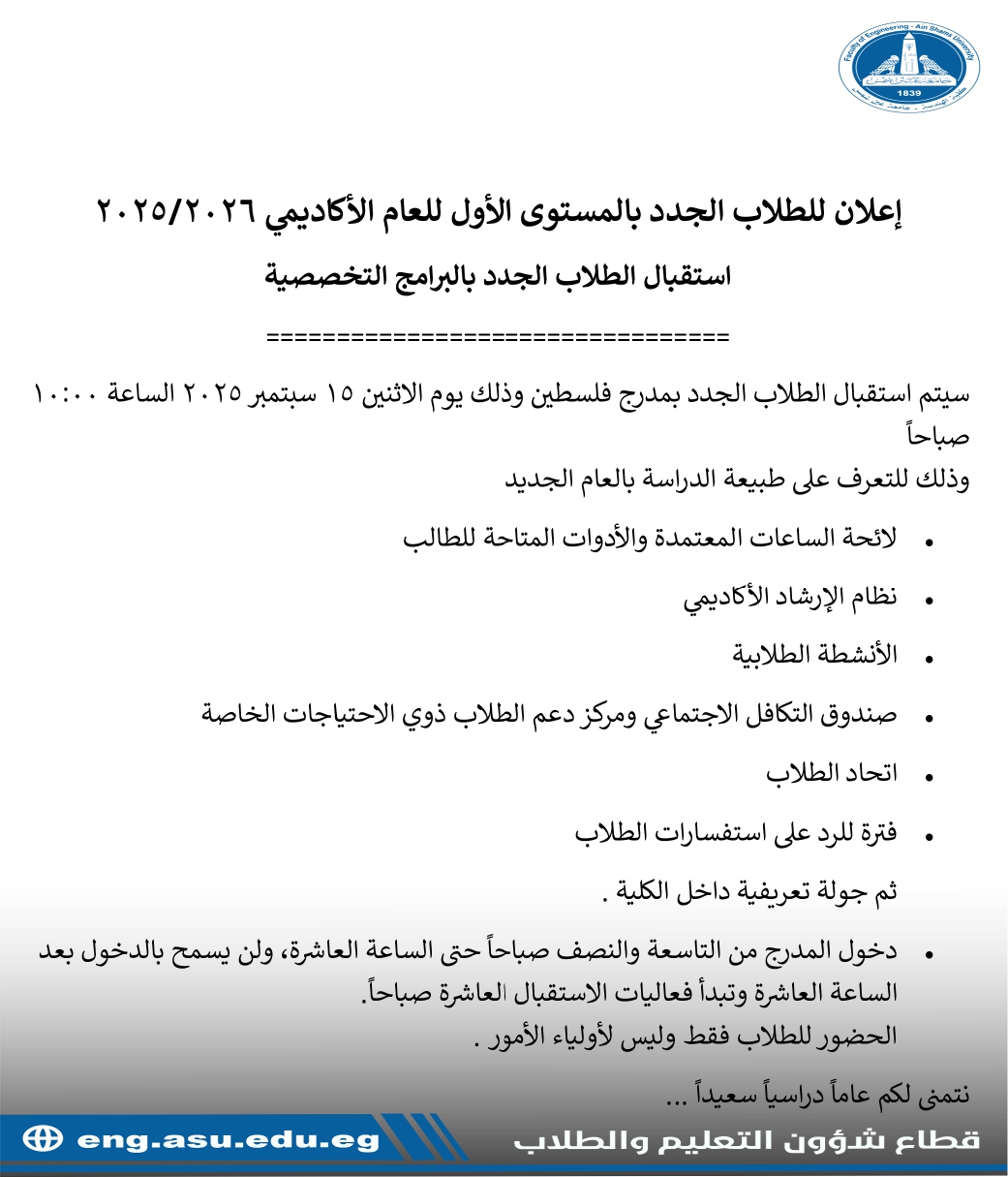 إعلان للطلاب الجدد بالمستوى الأول للعام الأكاديمي 2026/2025 استقبال الطلاب الجدد بالبرامج التخصصية