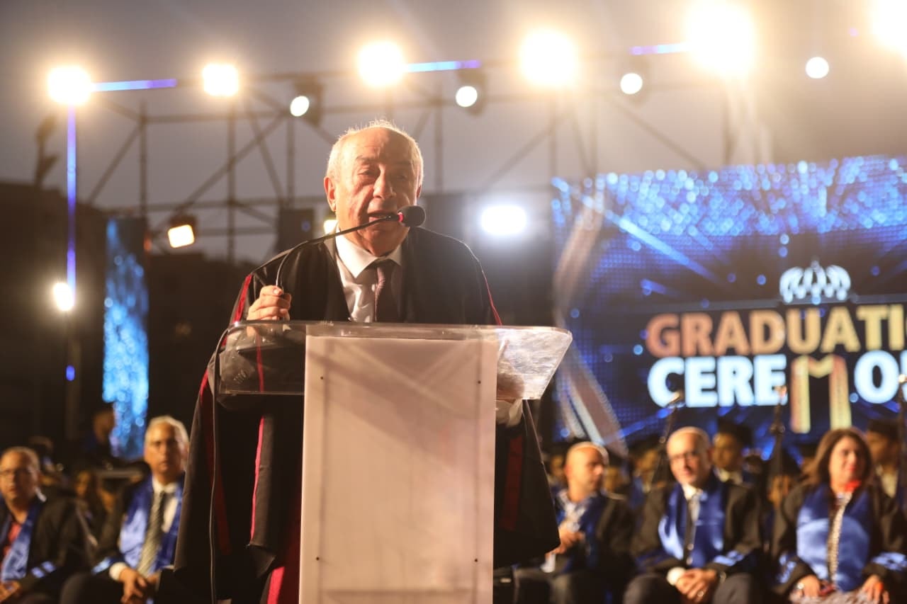 وأكد الدكتور أيمن عاشور سعادته بالمشاركة في هذه الاحتفالية المتميزة، موجهًا التهنئة للخريجين وأولياء أمورهم الذين كان لهم الدور الأكبر في دعم أبنائهم حتى بلوغ هذه المرحلة المهمة، معربًا عن فخره بانتمائه لكلية الهندسة بجامعة عين شمس، داعيًا الخريجين إلى الاعتزاز بهذا الصرح العريق الذي قدم لمصر والوطن العربي العديد من الشخصيات البارزة التي شغلت مناصب وزارية، وأسهمت في مسيرة التنمية، موضحًا أن الكلية خرجت 22 مهندسًا تقلدوا منصب وزير، واثنين من رؤساء الوزراء، إلى جانب نماذج ناجحة مثل المهندس هاني عازر، مشيرًا إلى الفترة التي تولى خلالها عمادة الكلية، والتي يعتز بها، حيث شهدت وضع مسودة الإستراتيجية الوطنية للتعليم العالي والبحث العلمي التي تم إعلانها عام 2023.