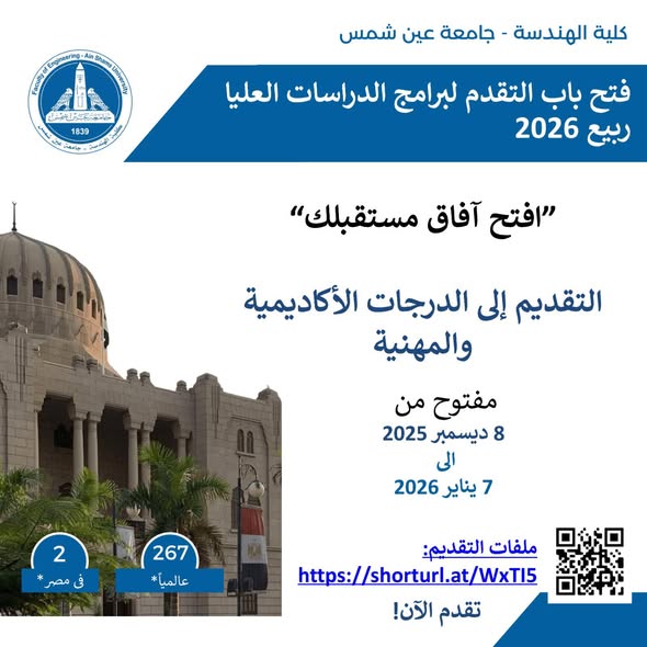 فتح باب التقديم للدراسات العليا بالكلية للدرجات الأكاديمية والمهنية