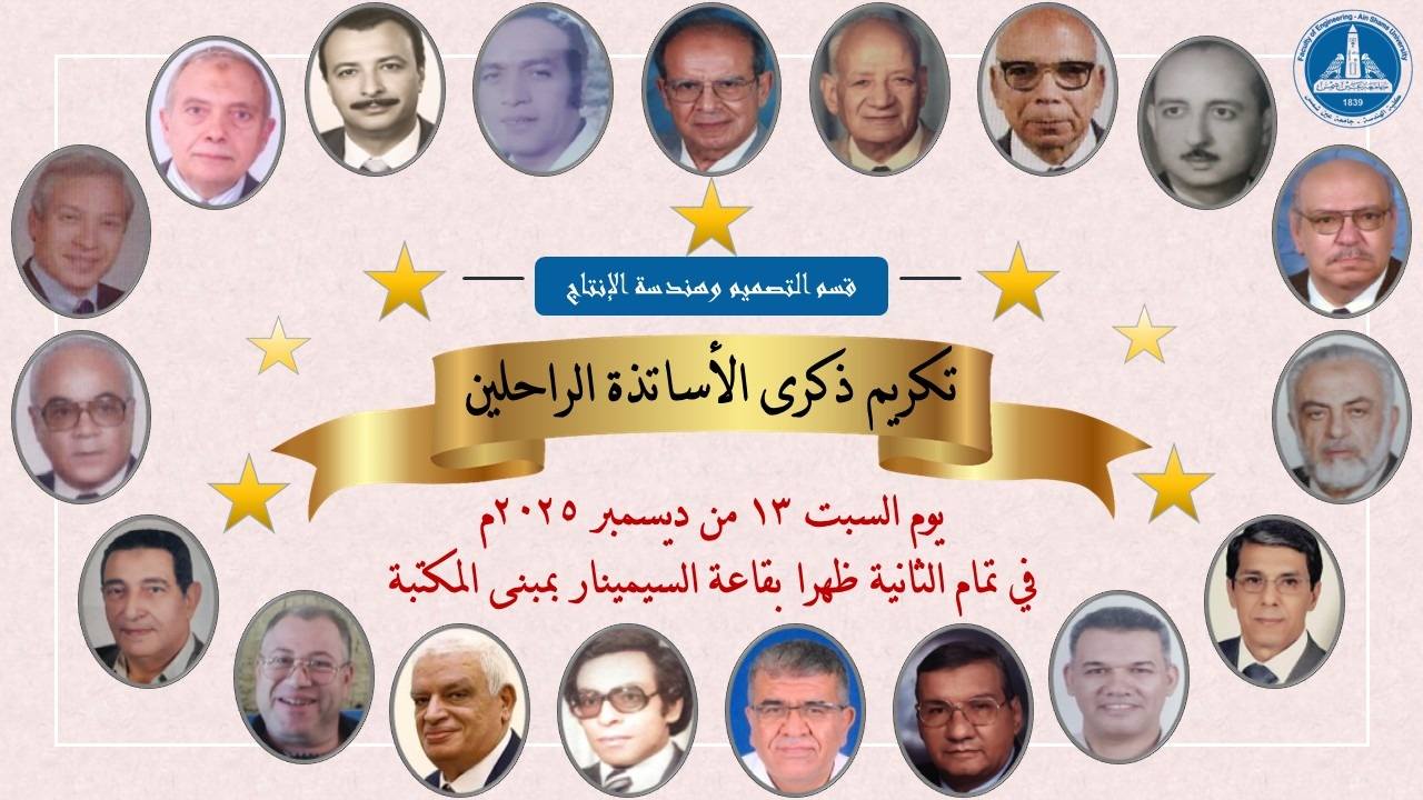 في إطار ترسيخ قيم الوفاء والعرفان بالجميل، نظم قسم التصميم وهندسة الإنتاج احتفالية لتكريم ذكرى الأساتذة الراحلين منذ نشأة القسم وحتى تاريخه، وذلك يوم السبت الموافق 13 ديسمبر 2025، في مبادرة تعكس روح الانتماء والتقدير.