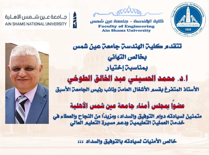 تهنئة الأستاذ الدكتور محمد الحسيني عبد الخالق الطوخي باختياره عضوًا بمجلس أمناء جامعة عين شمس الأهلية