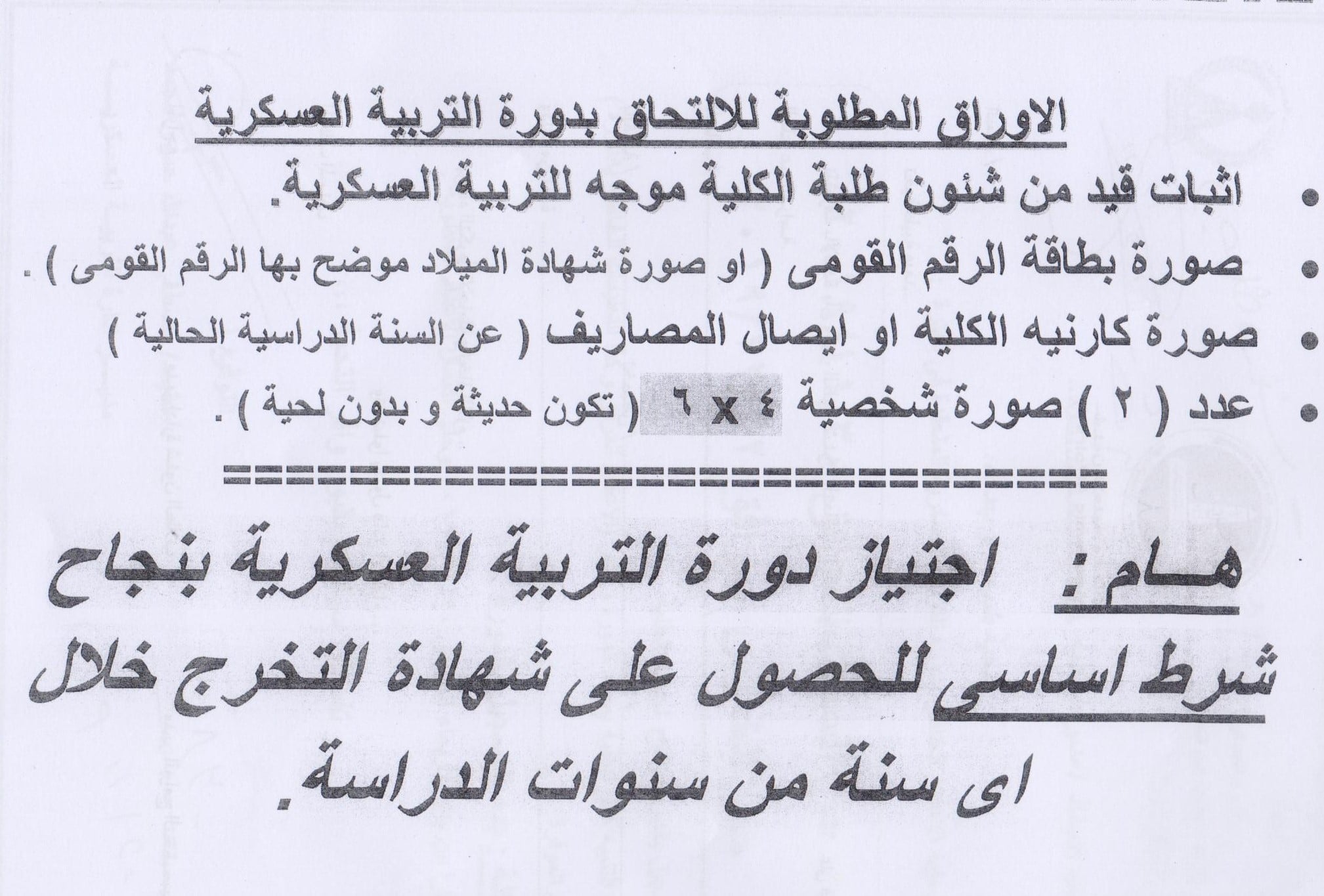 تعلن إدارة التربية العسكرية عند بدء التسجيل بدورة التربية العسكرية المنعقدة فى الفترة من يوم السبت الموافق 30-11-2019 وحتى الخميس الموافق 12-12-2019