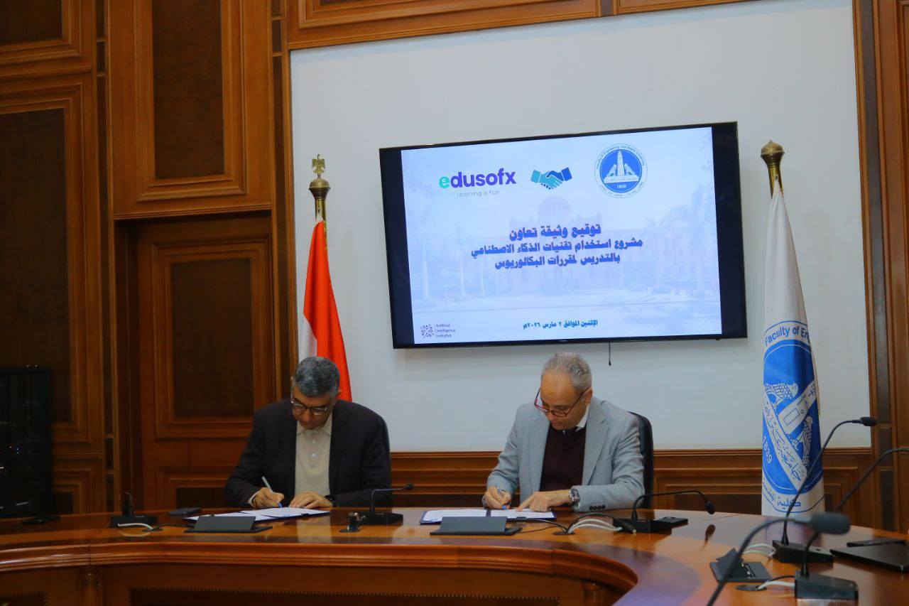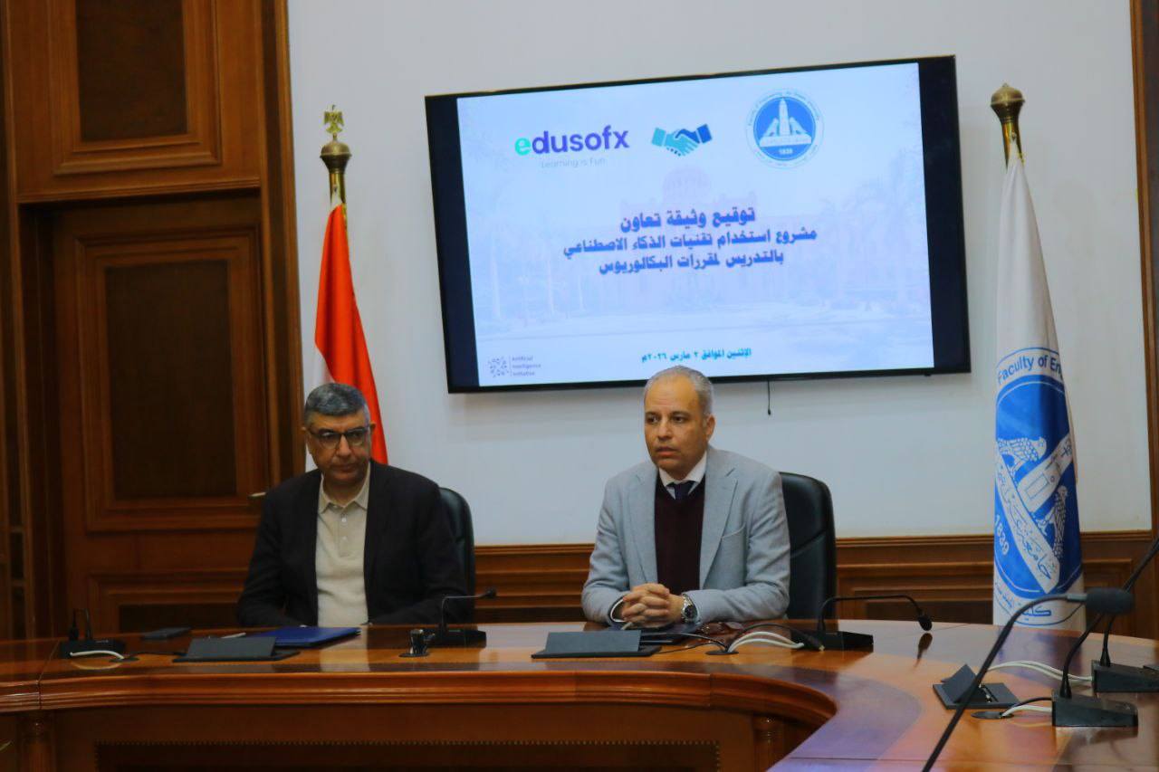 في إطار حرص كلية الهندسة جامعة عين شمس نحو تعزيز الشراكة مع المؤسسات المتخصصة , وكذلك دعم التحول الرقمي وتطبيقات الذكاء الاصطناعي في العملية التعليمية، وبرعاية الأستاذ الدكتور محمد ضياء زين العابدين رئيس جامعة عين شمس ، شهدت كلية الهندسة مراسم توقيع وثيقة تعاون مشترك بين الكلية وشركة إديوسوفكس لتقنية المعلومات يوم الاثنين 2 مارس 2026 م وقد جرت مراسم التوقيع بقاعة مجلس الكلية بين الأستاذ الدكتور/ عمرو عبد السلام شعت عميد الكلية و المهندس حاتم سلام - رئيس مجلس إدارة شركة إديوسوفكس لتقنية المعلومات و بحضور المهندس أحمد طلبة مدير الشراكات و المشروعات بالشركة والأستاذ الدكتور / مروة ابو الفتوح خليفة – وكيل الكلية لشئون الدراسات العليا والبحوث والأستاذ الدكتور / محمد أحمد ابراهيم عبد العزيز – وكيل الكلية لشئون التعليم والطلاب و السيد الدكتور / عمرو البنهاوى – مقرر لجنة الذكاء الإصطناعى بالكلية والسادة رؤساء الأقسام المعنية و نخبة من اعضاء هيئه التدريس القائمين على تدريس المقررات الخاصة بالمبادرة.