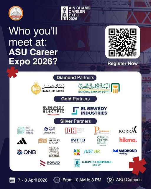 أيام قليلة تفصلنا عن الحدث التوظيفي الأضخم لجامعة عين شمس.. تدعوكم كلية هندسة عين شمس للمشاركة بقوة في الملتقى التوظيفي لجامعة عين شمس "ASU Career Expo 2026" في نسخته الخامسة والجديدة كلياً المنظم من خلال مركز توظيف جامعة عين شمس.
